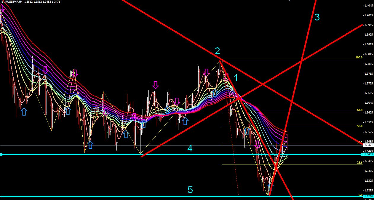 ライン4(1.3433)を下回ったら、下方向に転じた事を疑うべき。